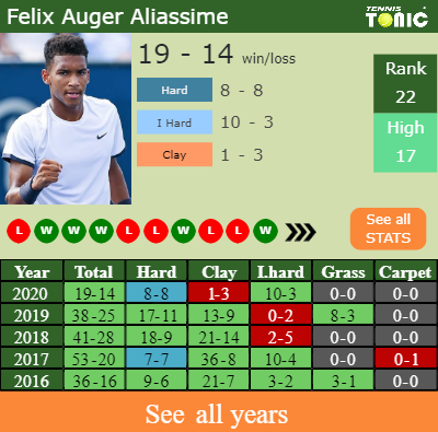 Auger-Aliassime has a 19-14 win-loss record in 2020, 10-3 on indoor hard courts (See FULL STATS).