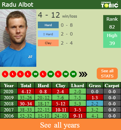 Albot has a 4-12 win-loss record in 2020, 2-0 on indoor hard courts (See FULL STATS).
