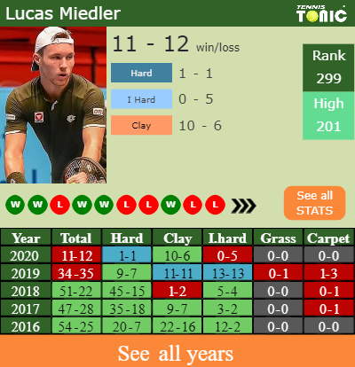 Lucas has a 11-12 win-loss record in 2020, 0-0 on carpet (See FULL STATS).