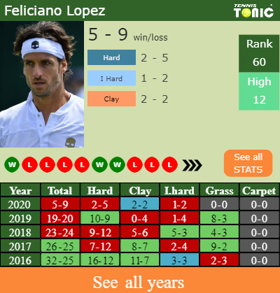 Lopez has a 5-9 win-loss record in 2020, 1-2 on indoor hard courts (See FULL STATS).