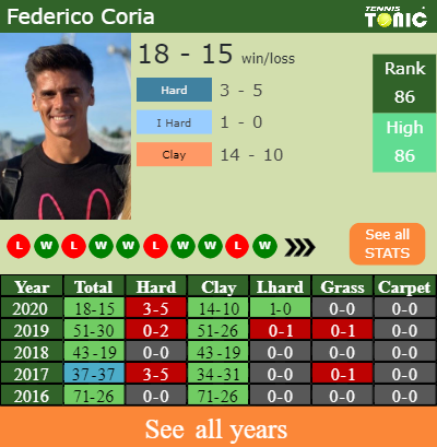 Coria has a 18-15 win-loss record in 2020, 1-0 on indoor hard courts (See FULL STATS).