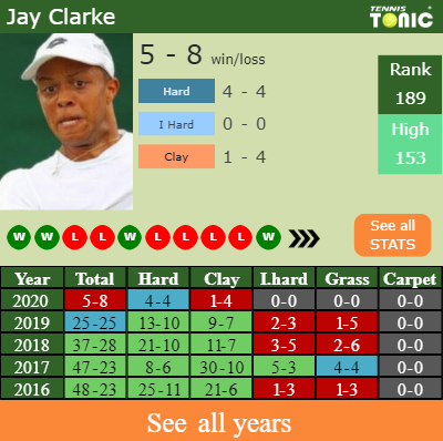 Clarke has a 5-8 win-loss record in 2020, 4-4 on hard (See FULL STATS).