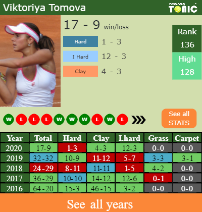 The Bulgarian has a 17-9 win-loss record in 2020, 1-3 on hard (See FULL STATS).