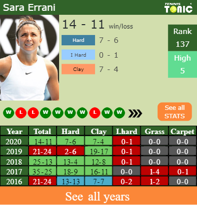 Errani has a 14-11 win-loss record in 2020, 7-6 on hard (See FULL STATS).