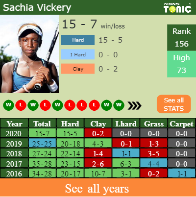 Vickery has a winning record in the last 10 years having won 57% of her matches (285-216). 15-5 on hard in 2020. In connection with her performance on the same surface of this tournament, Vickery has a 180-132 match record in the last years on hard.