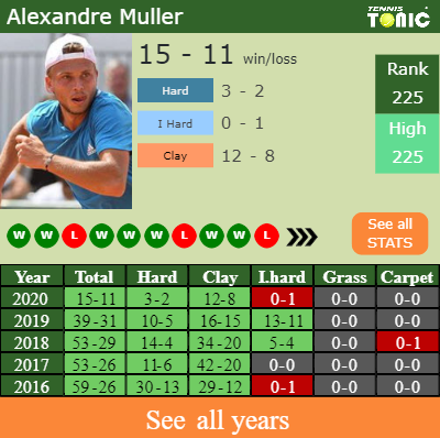 Alexandre has a 15-11 win-loss record in 2020, 12-8 on clay (See FULL STATS).