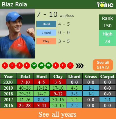 The Slovenian has a 7-10 win-loss record in 2020, 3-5 on clay (See FULL STATS).