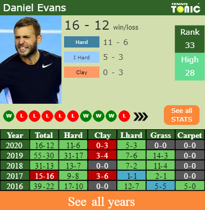 The Brit has a 16-12 win-loss record in 2020, 5-3 on indoor hard courts (See FULL STATS).