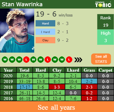 Stan has a 19-6 win-loss record in 2020, 2-1 on indoor hard courts (See FULL STATS).