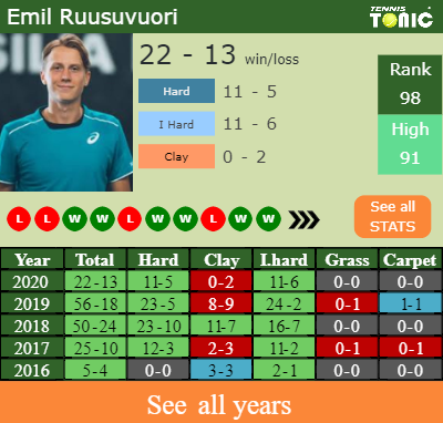 Ruusuvuori has a 22-13 win-loss record in 2020, 11-6 on indoor hard courts (See FULL STATS).