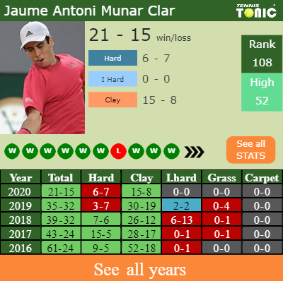 Jaume has a 21-15 win-loss record in 2020, 15-8 on clay (See FULL STATS).