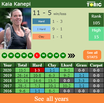 Kanepi has a solid win-loss record in the last 10 years having won 65% of her matches (227-122). 9-1 on indoor hard courts in 2020. In connection with her performance on the same surface of this tournament, Kanepi has a 44-14 record in the last years on indoor hard courts.