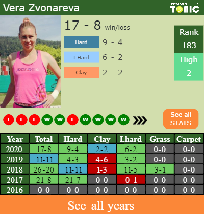 Vera has a 17-8 win-loss record in 2020, 6-2 on indoor hard courts (See FULL STATS).