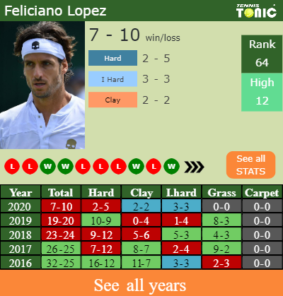 Feliciano has a 7-10 win-loss record in 2020, 3-3 on indoor hard courts (See FULL STATS).