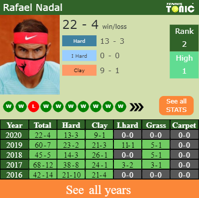 Rafael has a 22-4 win-loss record in 2020, 0-0 on indoor hard courts (See FULL STATS).