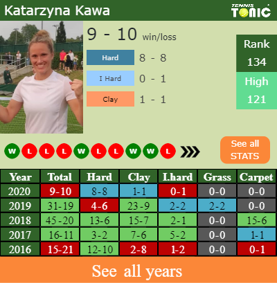 Kawa has a 9-10 win-loss record in 2020, 1-1 on clay (See FULL STATS).