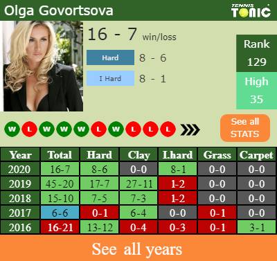 Olga has a 16-7 win-loss record in 2020, 0-0 on clay (See FULL STATS).