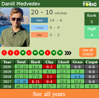 Medvedev has a solid win-loss record in the last 8 years having won 67% of his matches (315-153). 6-4 on indoor hard courts in 2020. Talking about his performance on the same surface of this event, Medvedev has a 83-44 record in the last 8 years on indoor hard courts.