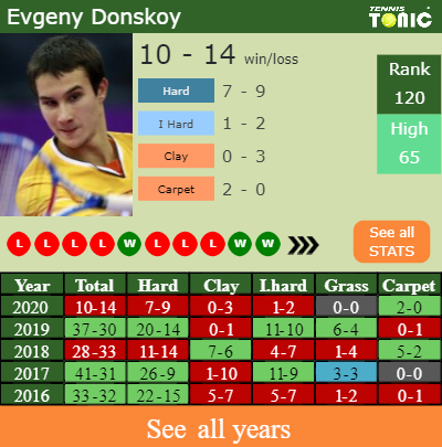 Donskoy has a 10-14 win-loss record in 2020, 2-0 on carpet (See FULL STATS).