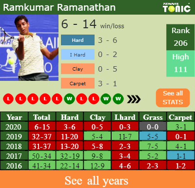 Ramanathan has a 6-15 win-loss record in 2020, 3-1 on carpet (See FULL STATS).