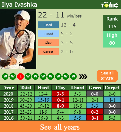 Ilya has a 22-12 win-loss record in 2020, 2-0 on carpet (See FULL STATS).