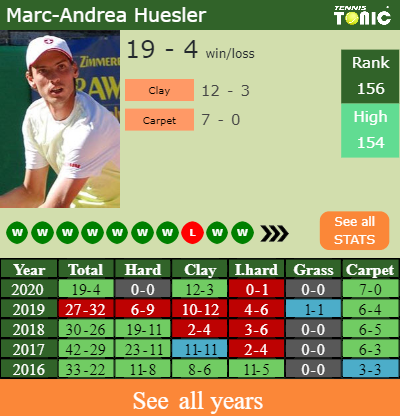 Huesler has a 19-4 win-loss record in 2020, 7-0 on carpet (See FULL STATS).