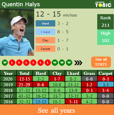the French player has a 12-15 win-loss record in 2020, 8-5 on indoor hard courts (See FULL STATS).