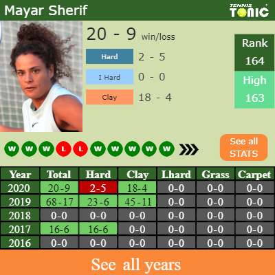 Sherif has a 20-9 win-loss record in 2020, 18-4 on clay (See FULL STATS).