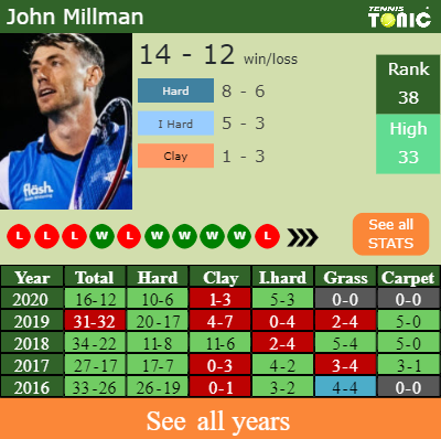 Millman has a 16-12 win-loss record in 2020, 5-3 on indoor hard courts (See FULL STATS).