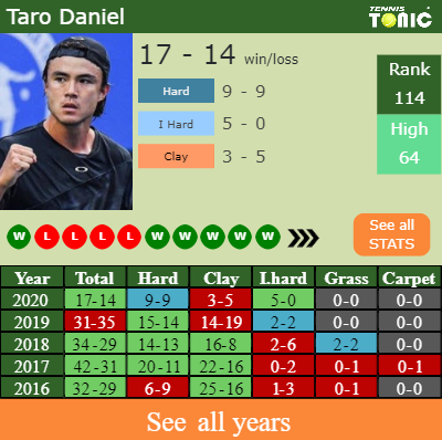 Daniel has a 17-14 win-loss record in 2020, 5-0 on indoor hard courts (See FULL STATS).