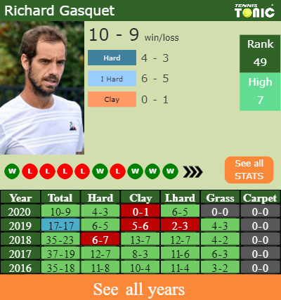 Gasquet has a solid record in the last 10 years having won 64% of his matches (339-188). 6-5 on indoor hard courts in 2020. Regarding his performance on the same surface of this competition, Gasquet has a 92-49 record in the last years on indoor hard courts.