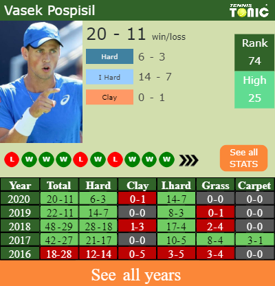 Pospisil has a 20-11 win-loss record in 2020, 14-7 on indoor hard courts (See FULL STATS).