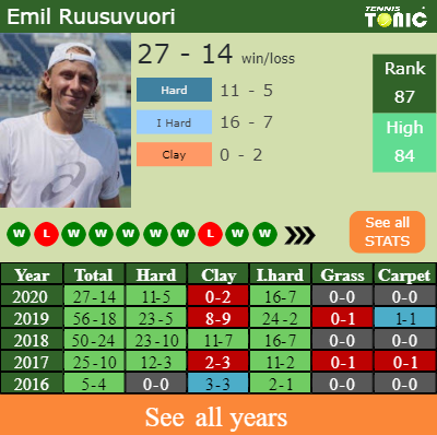 Ruusuvuori has a solid win-loss record in the last 6 years having won 69% of his matches (167-76). 16-7 on indoor hard courts in 2020. Talking about his performance on the same surface of this tournament, Ruusuvuori has a 69-20 match record in the last 6 years on indoor hard courts.