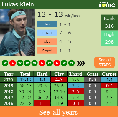 Lukas has a 13-13 win-loss record in 2020, 7-6 on indoor hard courts (See FULL STATS).