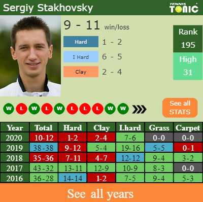 Stakhovsky has a 10-12 win-loss record in 2020, 7-6 on indoor hard courts (See FULL STATS).