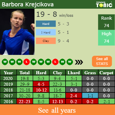 Krejcikova has a solid record in the last 10 years having won 65% of her matches (297-161). 5-1 on indoor hard courts in 2020. In connection with her performance on the same surface of this tournament, Krejcikova has a 22-18 match record in the last years on indoor hard courts.