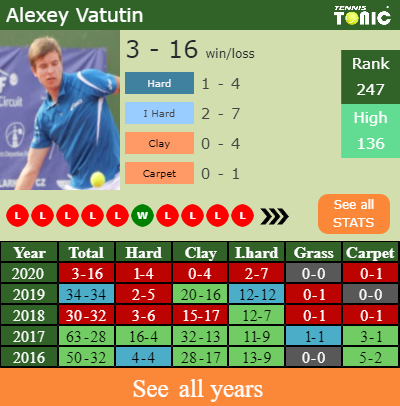 Vatutin has a 3-16 win-loss record in 2020, 2-7 on indoor hard courts (See FULL STATS).