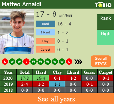 Matteo has a 17-8 win-loss record in 2020, 1-2 on indoor hard courts (See FULL STATS).