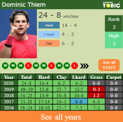 The Austrian has a 24-8 win-loss record in 2020, 4-2 on indoor hard courts (See FULL STATS).