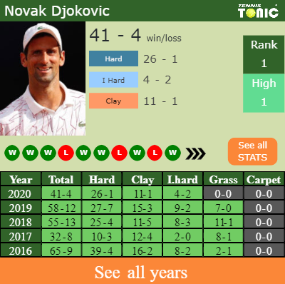 Djokovic has a 41-4 win-loss record in 2020, 4-2 on indoor hard courts (See FULL STATS).