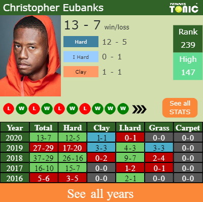 Eubanks has conceded 2 set in the tournament to win 54% of the points he played.