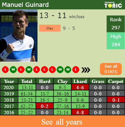 In terms of his career, Guinard has an overall 210-130 record. He has positive 132-68 record on clay.