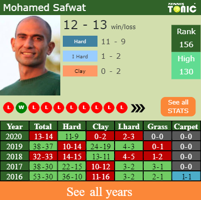 Safwat has a 13-14 win-loss record in 2020, 0-2 on clay (See FULL STATS).