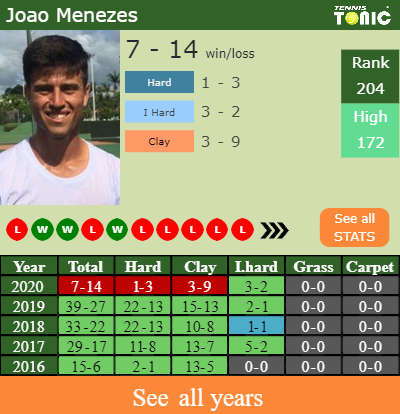 The Brazilian has a 7-14 win-loss record in 2020, 3-9 on clay (See FULL STATS).