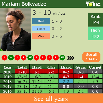 The Georgean has a 3-10 win-loss record in 2020, 1-3 on hard (See FULL STATS).
