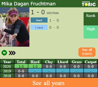 Dagan Fruchtman has a fantastic win-loss record in the last 3 years having won 100% of her matches (1-0). 1-0 on hard in 2020. In connection with her performance on the same surface of this competition, Dagan Fruchtman has a 1-0 win-loss record in the last 3 years on hard.