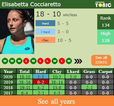 Cocciaretto has a solid match record in the last 4 years having won 66% of her matches (81-41). 5-5 on hard in 2020. In connection with her performance on the same surface of this event, Cocciaretto has a 11-10 record in the last 4 years on hard.