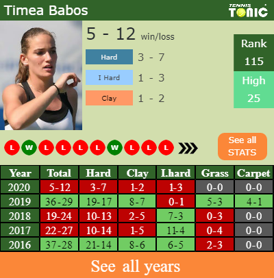 Babos has a 5-12 win-loss record in 2020, 3-7 on hard (See FULL STATS).