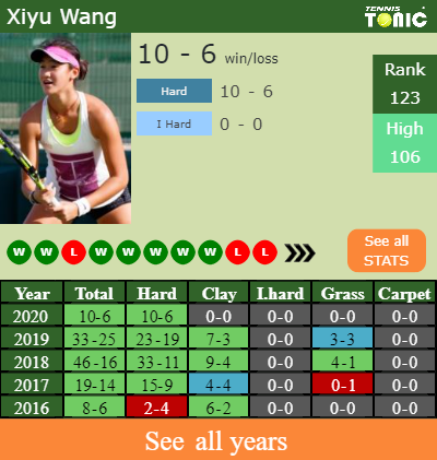 Xiyu has a 10-6 win-loss record in 2020, 10-6 on hard (See FULL STATS).
