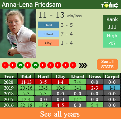Anna-Lena has a 11-13 win-loss record in 2020, 7-4 on indoor hard courts (See FULL STATS).